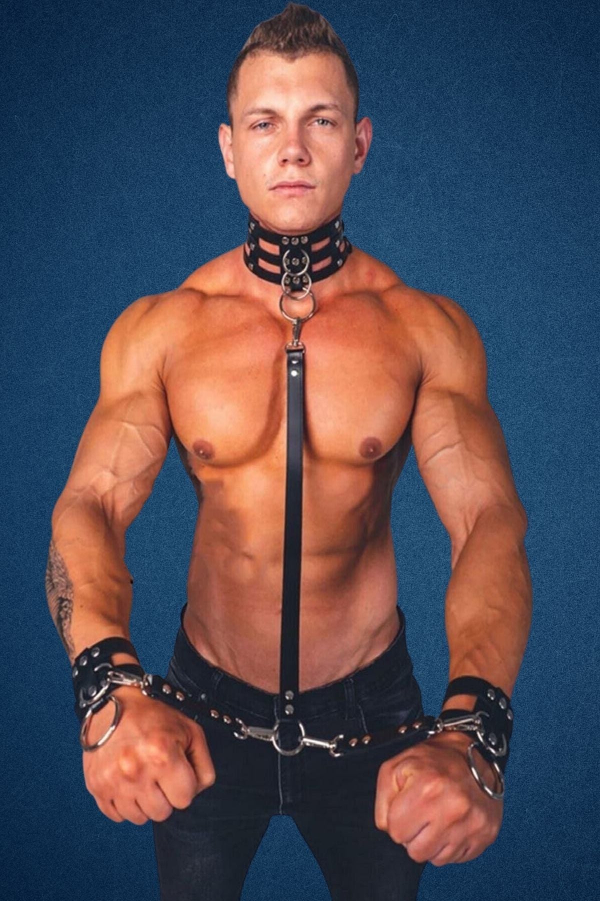 Kalın Deri Tasma Ve Kelepçe Harness Fantezi Aksesuarı