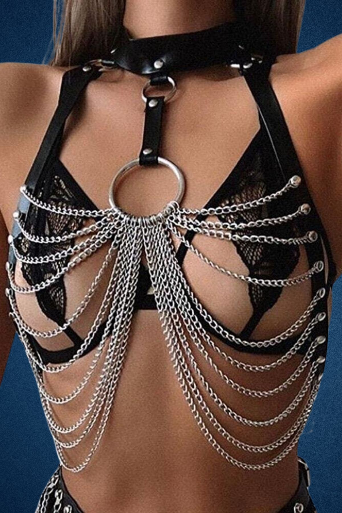 Zincir Detaylı Boyundan Bağlamalı Fantazi Deri Harness Büstiyer- Üst